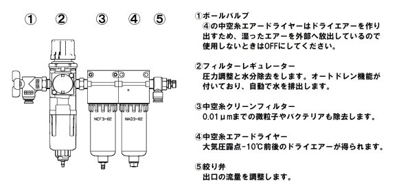 下記ような使用に最適なドライエアー供給システムです。 エアー駆動機器の保護(結露防止) 装置供給エアーの除湿 筐体内へのドライエアーパージ グローブボックス・デシケータへのドライエアーパージ