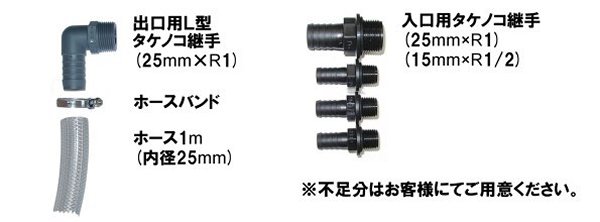 ■ベビージョーカーの入口について(KBJ-10N〜KBJ-60N) ベビージョーカーの入口は、左右に各2ヶ所あり、複数のコンプレッサーなど からのドレンを取り込めるようになっています(下写真参照)。 ベビージョーカーの処理能力以内でしたら、この4ケ所を利用して入口配管が 可能です。納入時には ・15Aホース用のタケノコ継手(3ヶ) ・25Aホース用タケノコ継手(1ヶ) が付属しています。